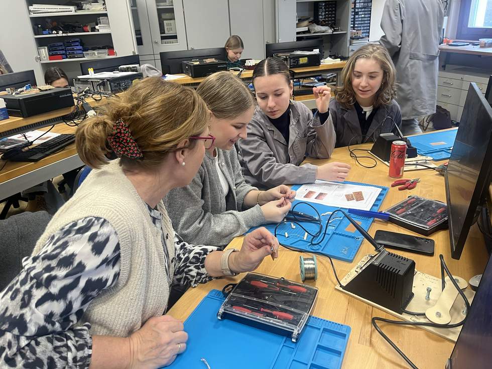 Mag. Berni Lutnik – wobei die Namensgleichheit mit einer an der HTL durchaus bekannten Persönlichkeit natürlich rein zufällig ist – kam gemeinsam mit ihren 24 Schülerinnen der 4. Klasse der Bildungsanstalt für Elementarpädagogik (BAfEP) zu Gast. Die jungen Damen, die sich in ihrer Ausbildung intensiv mit frühkindlicher Bildung, Spielpädagogik, Musik- und Bewegungserziehung sowie der Betreuung von Kindern im Kindergarten- und Hortbereich beschäftigen, betraten damit erstmals das für sie weitgehend unbekannte Terrain der technischen Werkstätten. Der Kontrast zu ihrem sonstigen Schulalltag hätte kaum größer sein können: Während an der BAfEP vor allem kreative, soziale und pädagogische Inhalte im Vordergrund stehen, dreht sich an der HTL Mössingerstraße alles um Elektronik, Elektrotechnik, Biomedizintechnik und Technische Informatik. Nach der herzlichen Begrüßung durch den Herrn Direktor übernahm Werkstättenleiter Alex Ronnacher die Führung. In einem kurzen, aber sehr anschaulichen Vortrag gab er den Besucherinnen einen Überblick über den Werkstättenunterricht an der HTL. Er erklärte die Sicherheitsvorschriften, die verschiedenen Arbeitsbereiche und welche Fertigkeiten die Schüler hier erwerben – von grundlegender Handwerkstechnik über Lötarbeiten bis hin zu präzisen Messungen und dem Umgang mit modernster Messtechnik.
