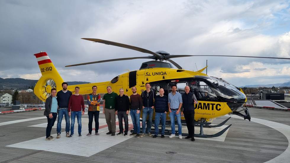 Nach dem Besuch der Rohrpostanlage, über die sämtliche Laborproben und andere dringende Sendungen transportiert werden, folgte der krönende Abschluss: der Hubschrauberlandeplatz. Dort konnten wir einen der 30 Christophorus‑Notarzthubschrauber des ÖAMTC – ein High‑Tech‑Gerät im Wert von etwa 7,5 Mio. € – aus nächster Nähe bestaunen.