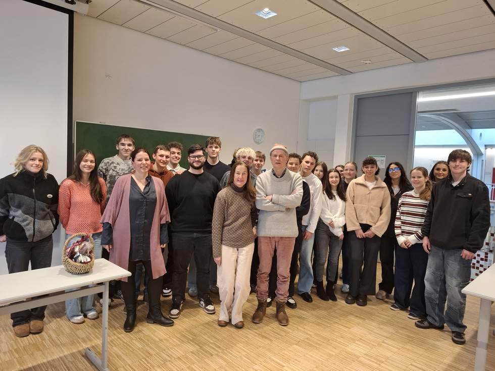 Für die Schülerinnen und Schüler bereitete er eine bislang unveröffentlichte, unterhaltsame Hommage an die Erzählung „Nicht nur zur Weihnachtszeit“ von Heinrich Böll vor. Anschließend stellte er sich Nachfragen zu seinem künstlerischen Schaffen und plauderte auch aus dem Nähkästchen des Kulturbetriebs, unter anderem über seine Gespräche mit dem nobelpreisgekrönten Kärntner Autor Peter Handke. Auch Mag. Harald Tranacher-Rainer und Mag. Gerda Wobik, als Deutschlehrerin der Klasse verantwortlich für die Organisation der Lesung, sowie Josef Winklers ebenfalls anwesende Ehefrau, die Fotografin Christina Schwichtenberg, lauschten begeistert.