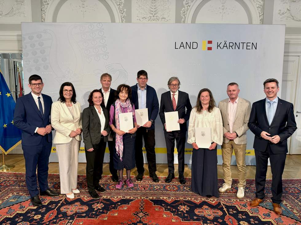 Landeshauptmann Ing. Daniel Fellner überreichte im Spiegelsaal der Kärntner Landesregierung Mag. Karin Jammer, MMag. Evelin Kofler, Dipl.-Ing. Johann Pleschko und Dipl.-Ing. Andreas Vidoni die Urkunden zur Ernennung zu Oberstudienrätinnen beziehungsweise Oberstudienräten. Ing. Dipl.-Päd. Heribert Jordan, BEd, wurde zum Oberschulrat ernannt. Auch Landeshauptmannstellvertreter Martin Gruber, Landesrätin Marika Lagger-Pöllinger und Bildungsdirektorin Mag. Isabella Penz gratulierten herzlich; die Schulgemeinschaft der HTL Mössingerstraße schließt sich gerne an!