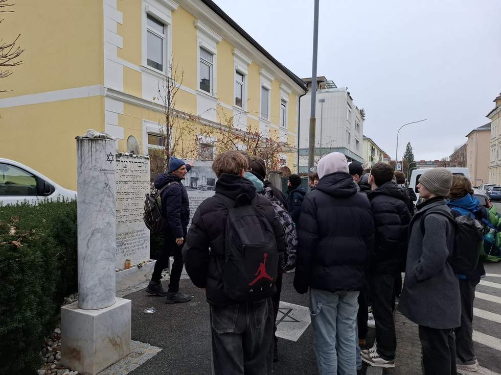 Gemeinsam mit BEd Maider Insunza Ramon ging es am 9.12.2025 zuerst zum jüdischen Teil des Friedhofs St. Ruprecht, anschließend zu einigen Stolpersteinen in der Bahnhofstraße und als Abschluss noch zur Gedenkstätte beim ehemaligen Bethaus in der Platzgasse. Die Schüler bewiesen durch ihre zahlreichen Fragen und Diskussionsbeiträge sowohl ein waches demokratisches Bewusstsein als auch ein tiefes menschliches Interesse für die Entstehungsbedingungen und die Auswirkungen des Antisemitismus und des Nationalsozialismus.